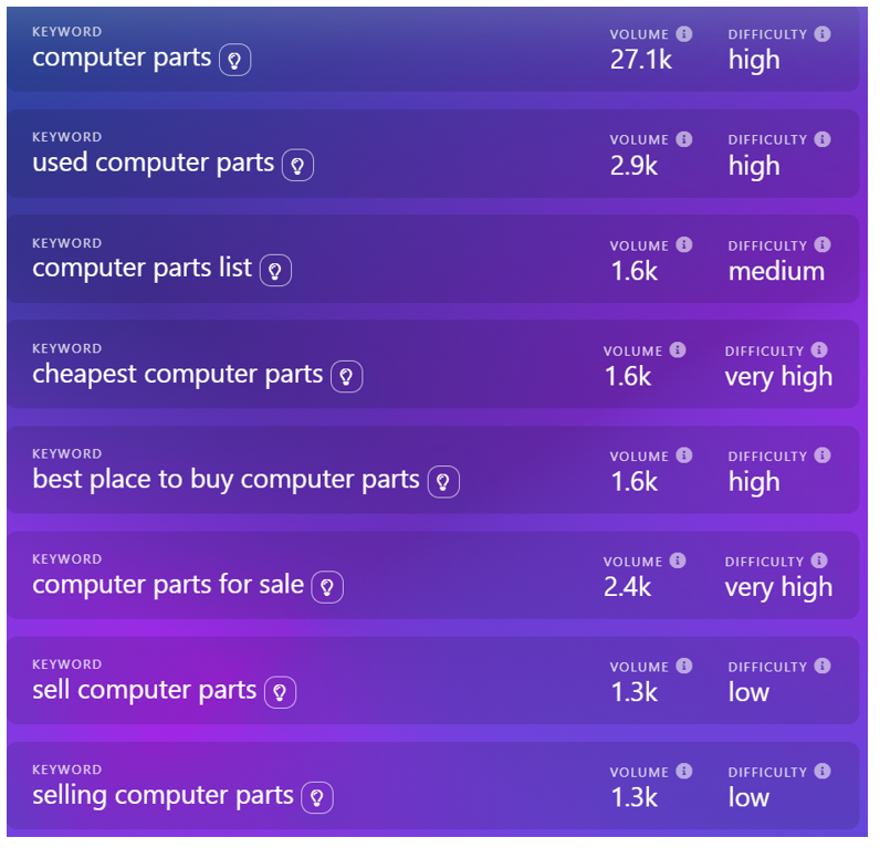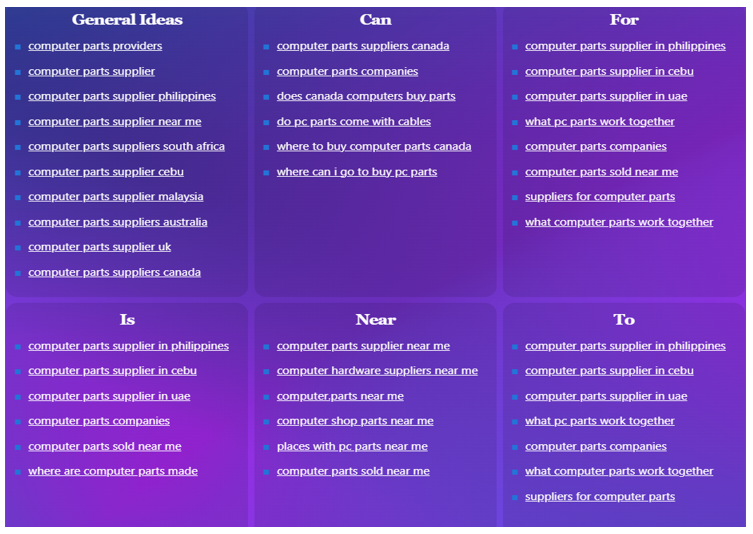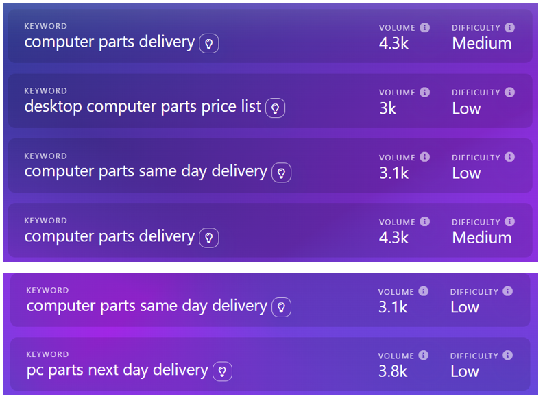 Here are some popular keyword variations we could work off of. We could substitute “computer” with “printer,” “server,” or other specifics as needed in these variations. If Latin Parts can offer same-day or next-day shipping, there are great opportunities for ranking with these terms.