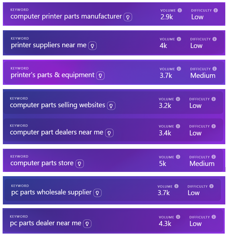 Page direction: This direction could go for all “parts” pages, including printers, servers, and computers. There are many “parts” keywords we can use, we just want to be mindful and not overlap too many between these pages and the ones previously covered. Options include: