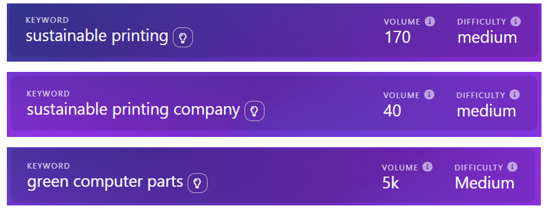 Page direction: This is a great chance to mention any specific types of eco-friendly components or standards the company uses. We can take advantage of the fact that many companies are concerned about the environmental impact of printers, ink cartridges, and electronics parts in general when we are selecting keywords.